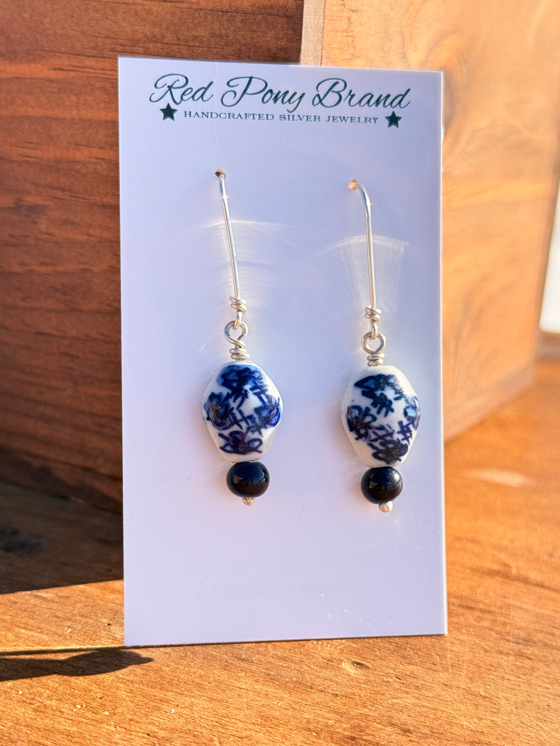 Cute little blue and white painted beads dangle off of sterling silver ear wires. Approximately 1.0" long with wires.