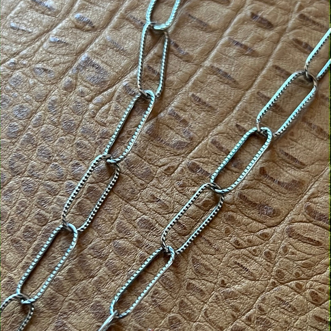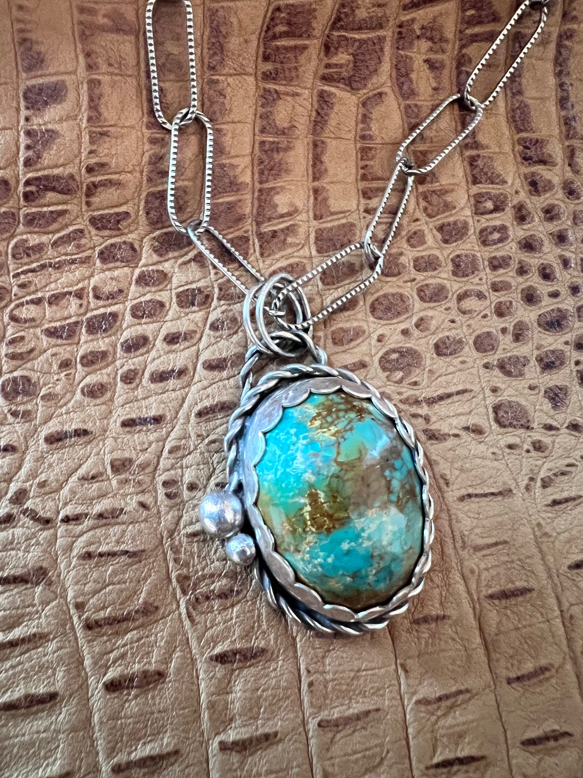 1+” Turquoise surrounded by sterling silver rope and embellishments. Patterned 18” Paperclip chain, sterling silver. Pendant comes off chain to wear different ways.
