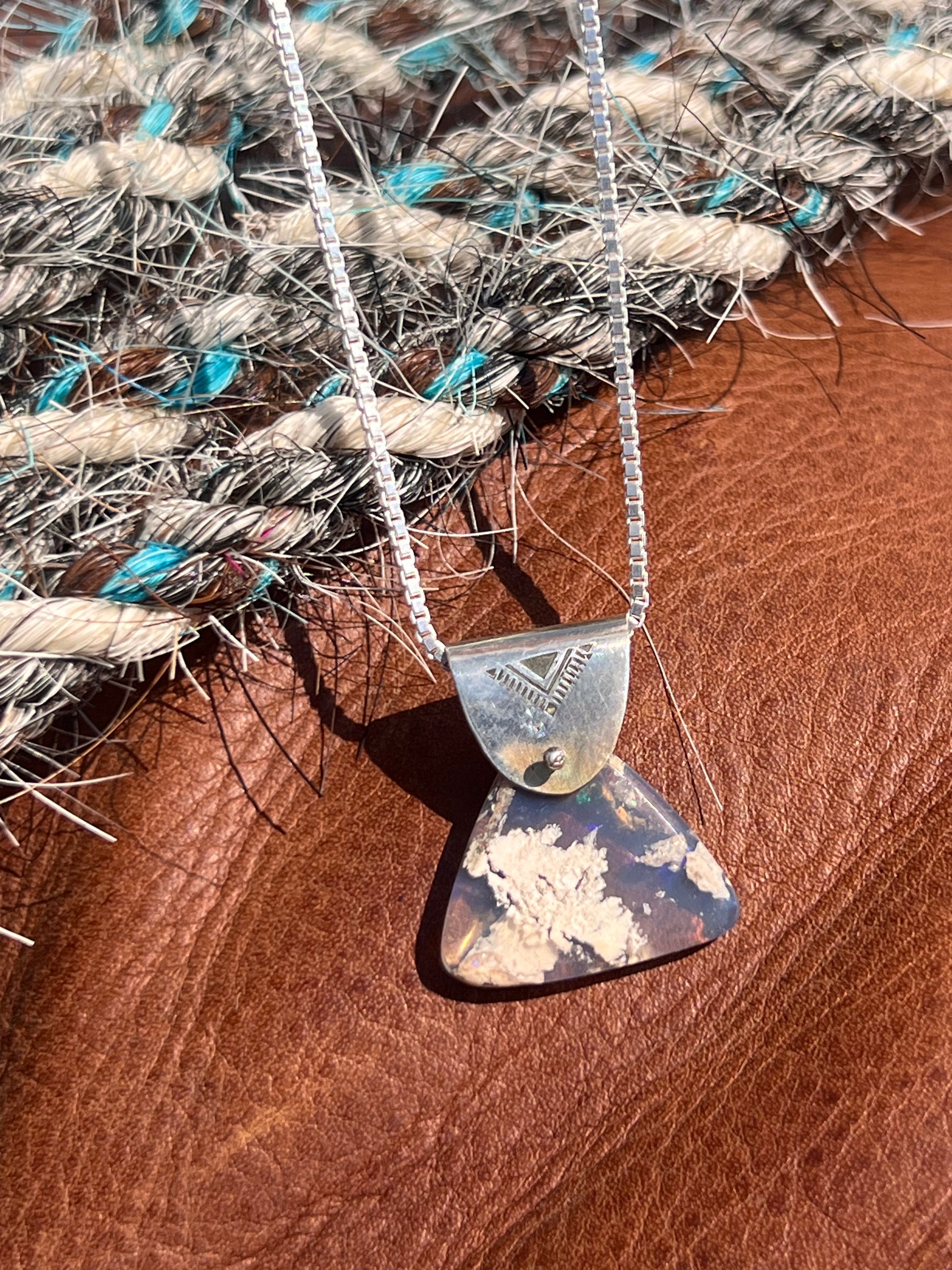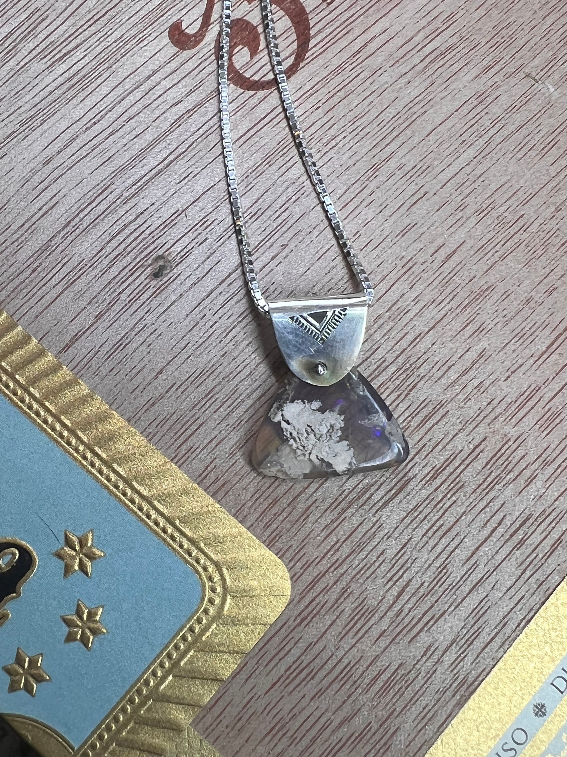 A flashy multicolored Australian opal with plumes inside swings from a hand stamped bail off of an 18” Italian silver box chain. Pendant is approximately 3/4”. Flashes of pink and purple in different lighting.