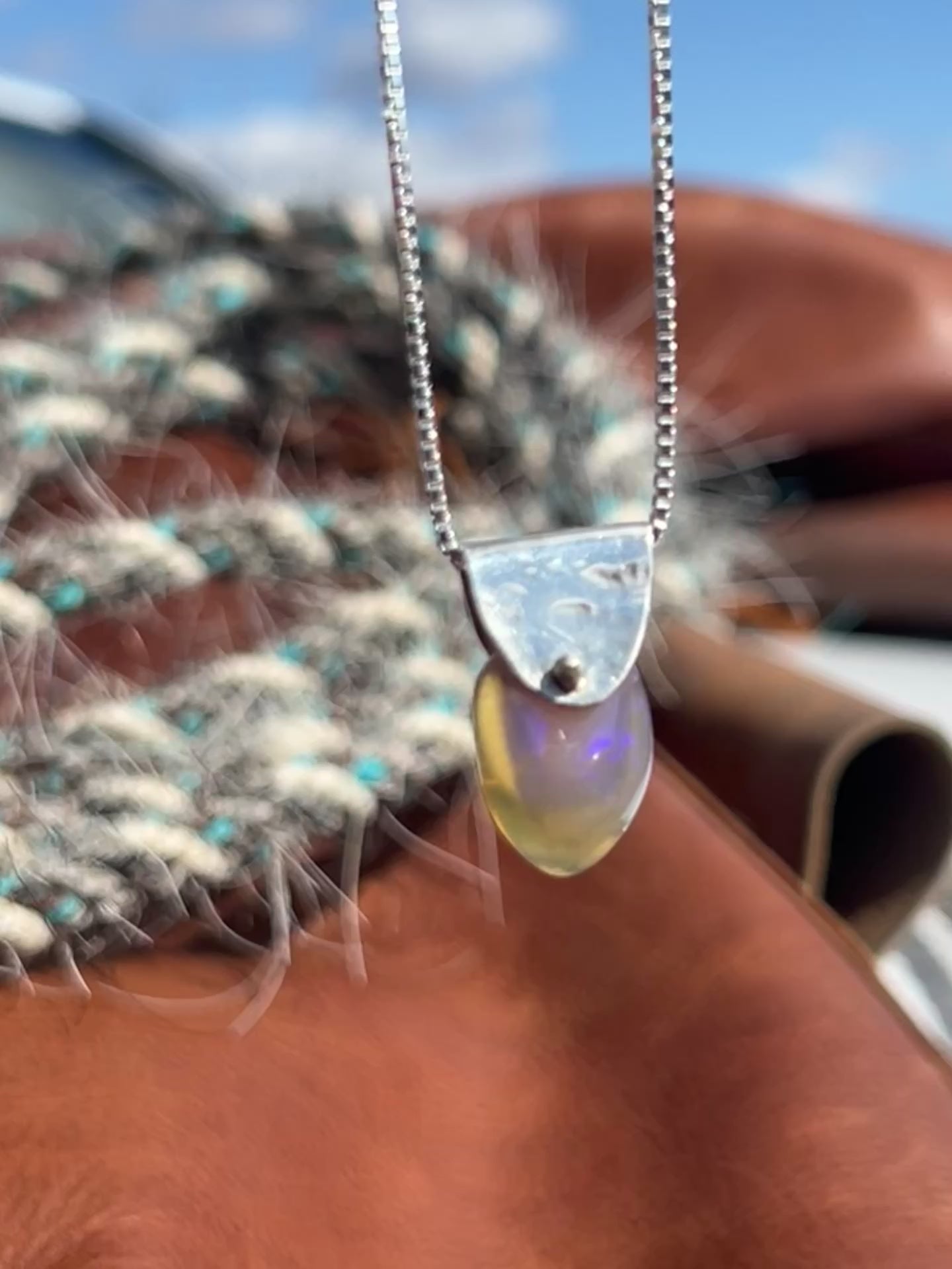 A flashy multicolored smooth Australian opal swings from a hammered bail off of an 18” Italian silver box chain. Pendant is approximately 3/4”.