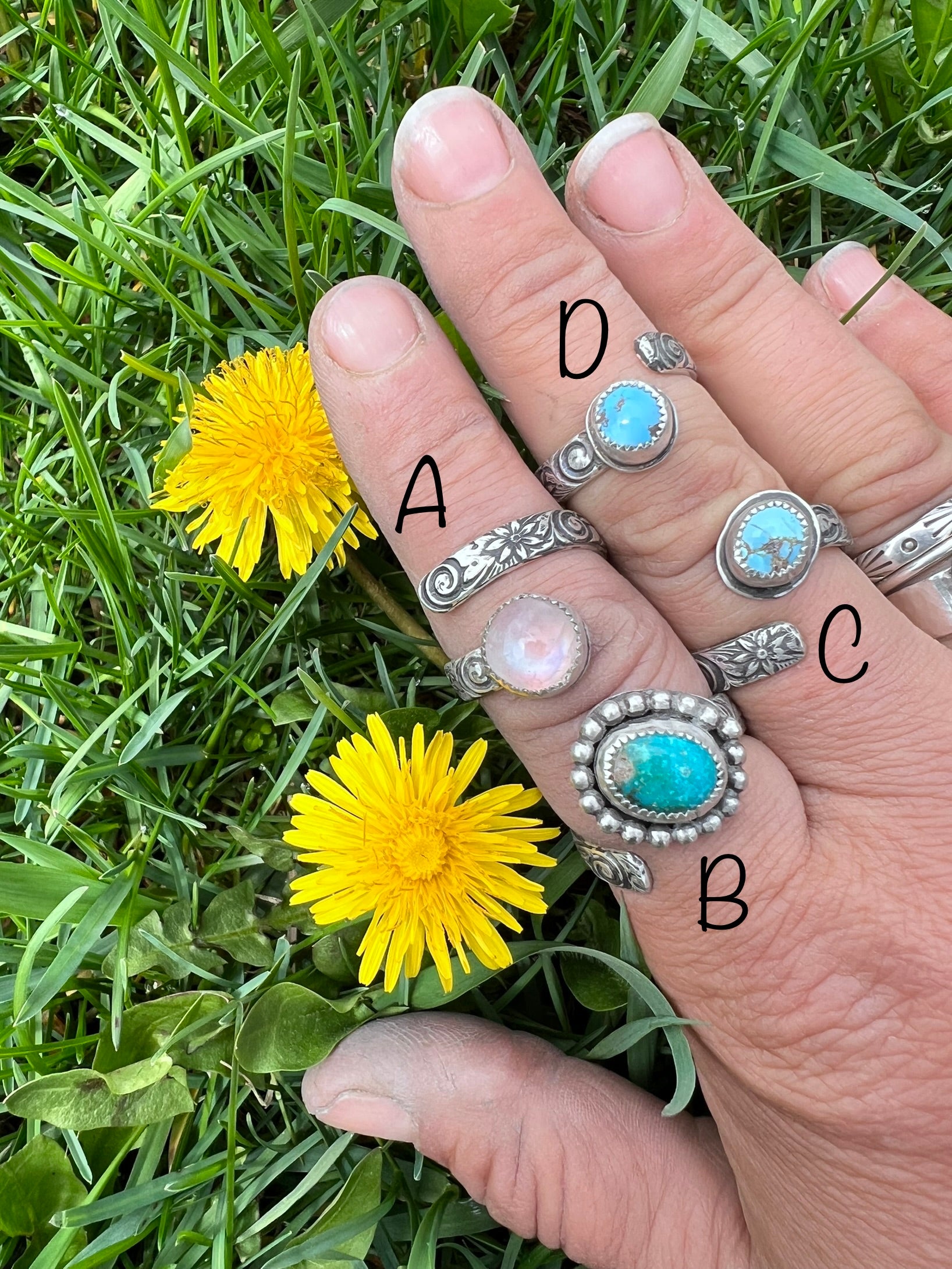 Floral patterns grace the adjustable band of these wrap rings. Choice of Moonstone, Lone Mountain Turquoise or Campitos Turquoise. Size range for each ring in options, every one is unique.
