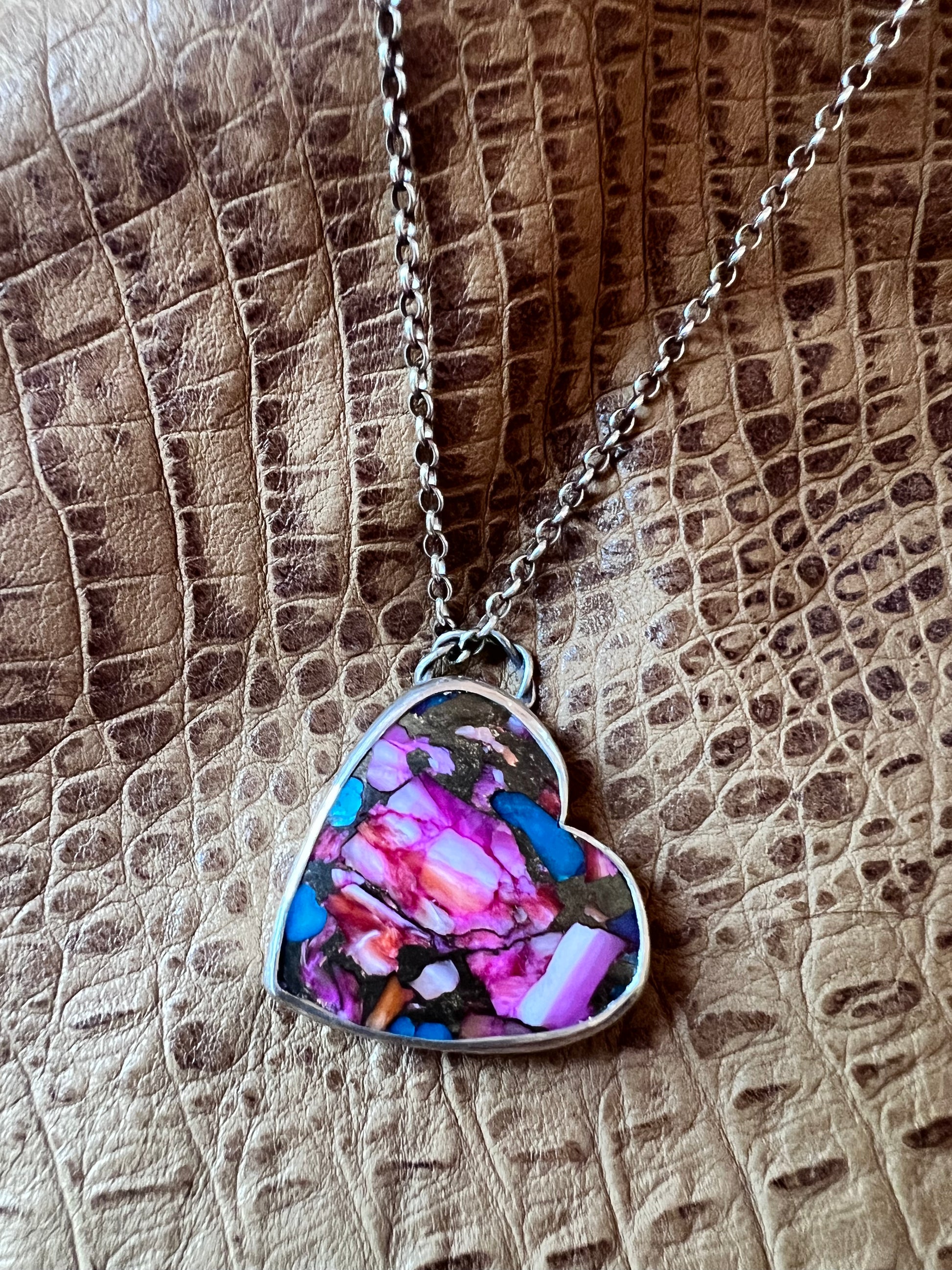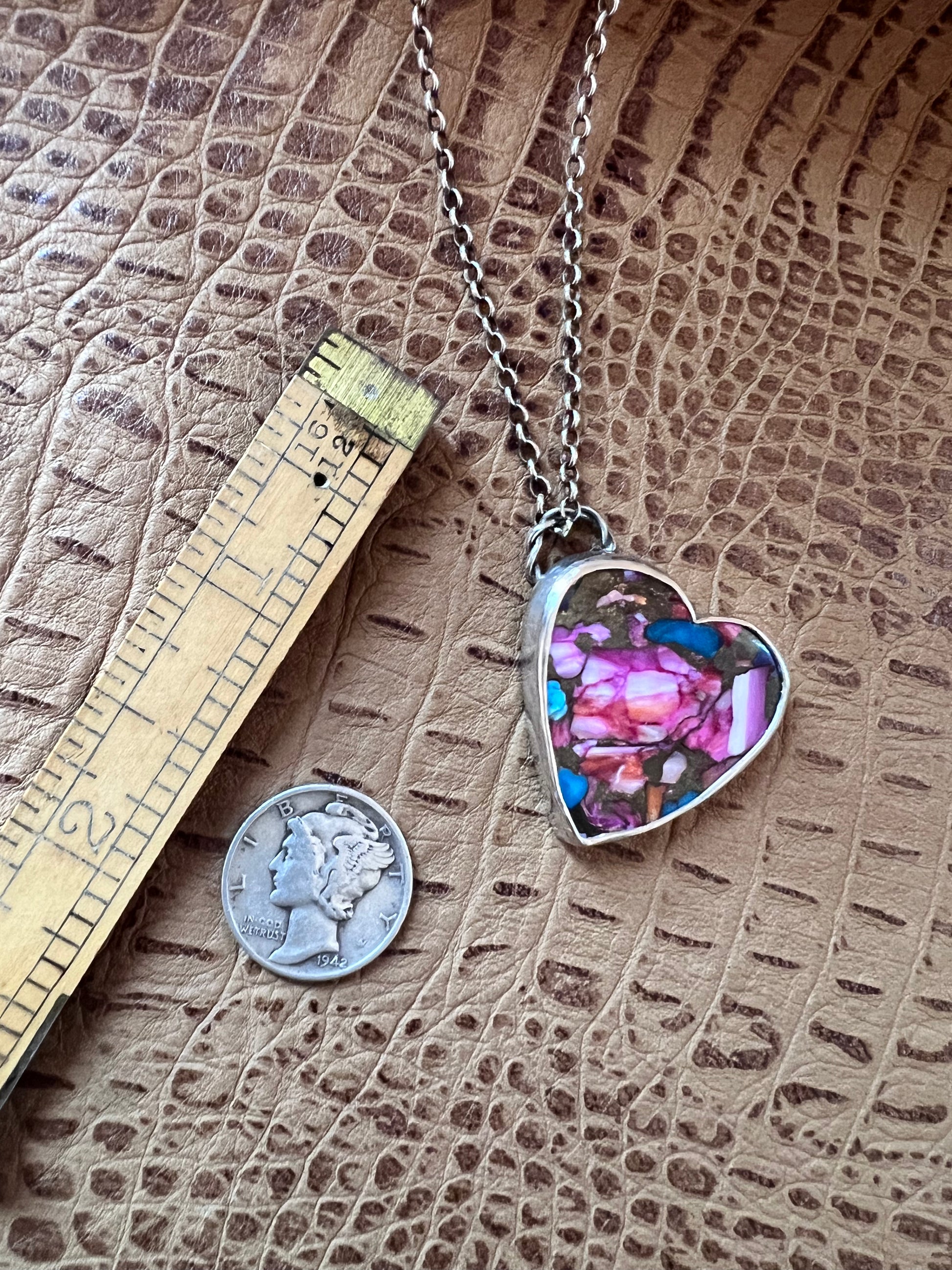 Pinks and blues in this Mohave Kingman heart. 1.5” at widest point. 20” Sterling chain.