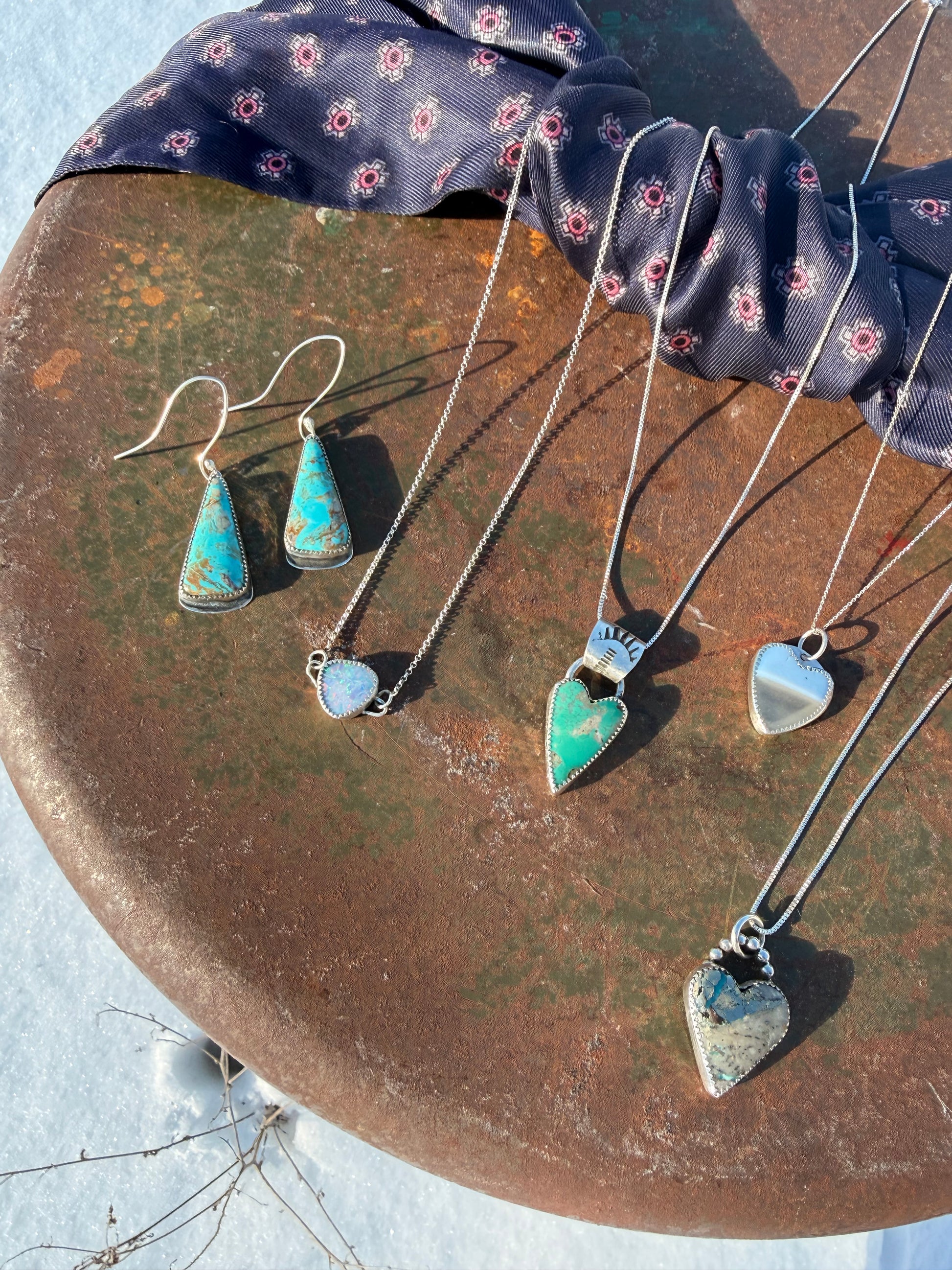 Stamped rays on the silver bail above a bright turquoise heart hang from a 20” chain. Open your heart to love and new experiences!