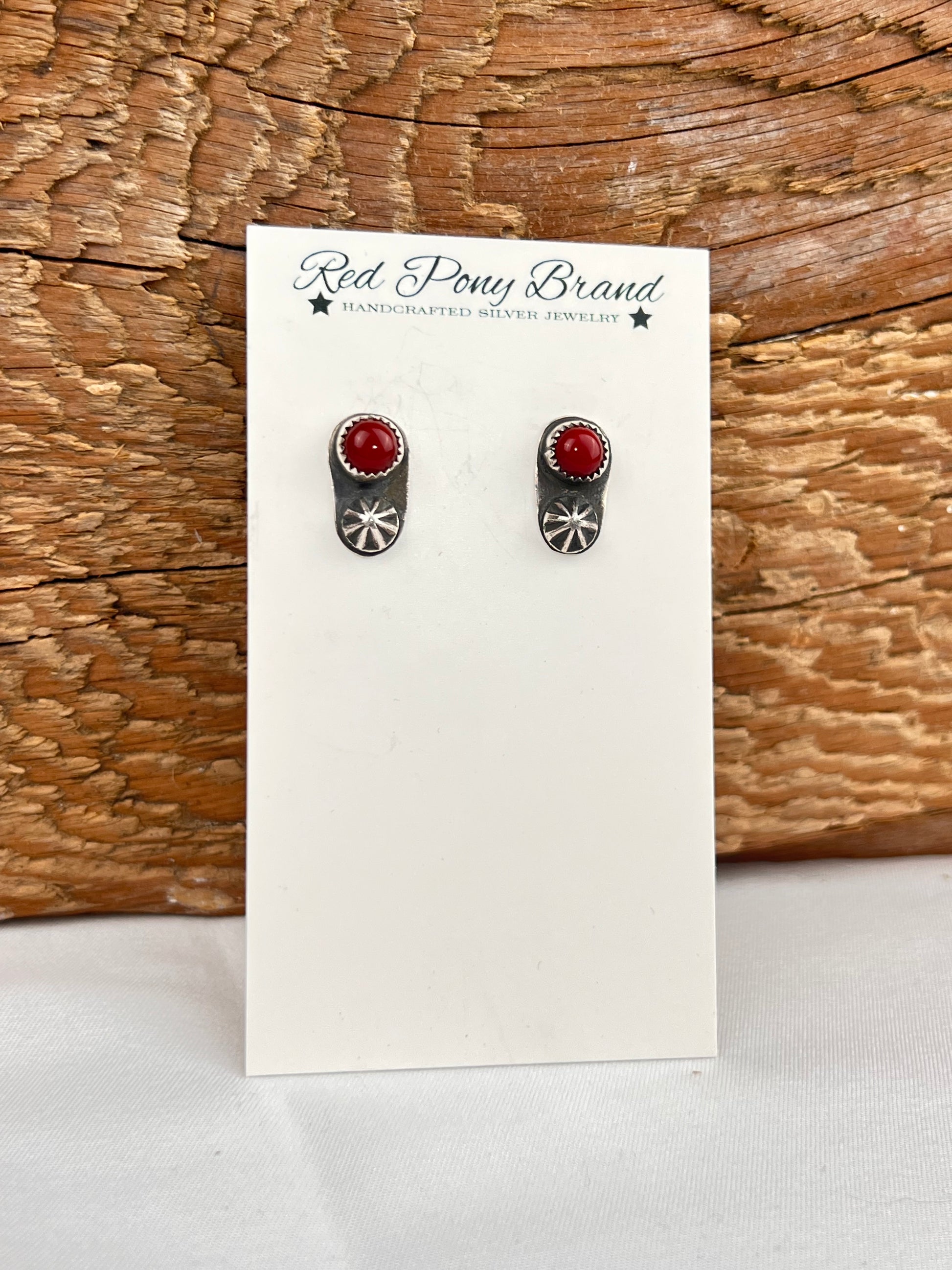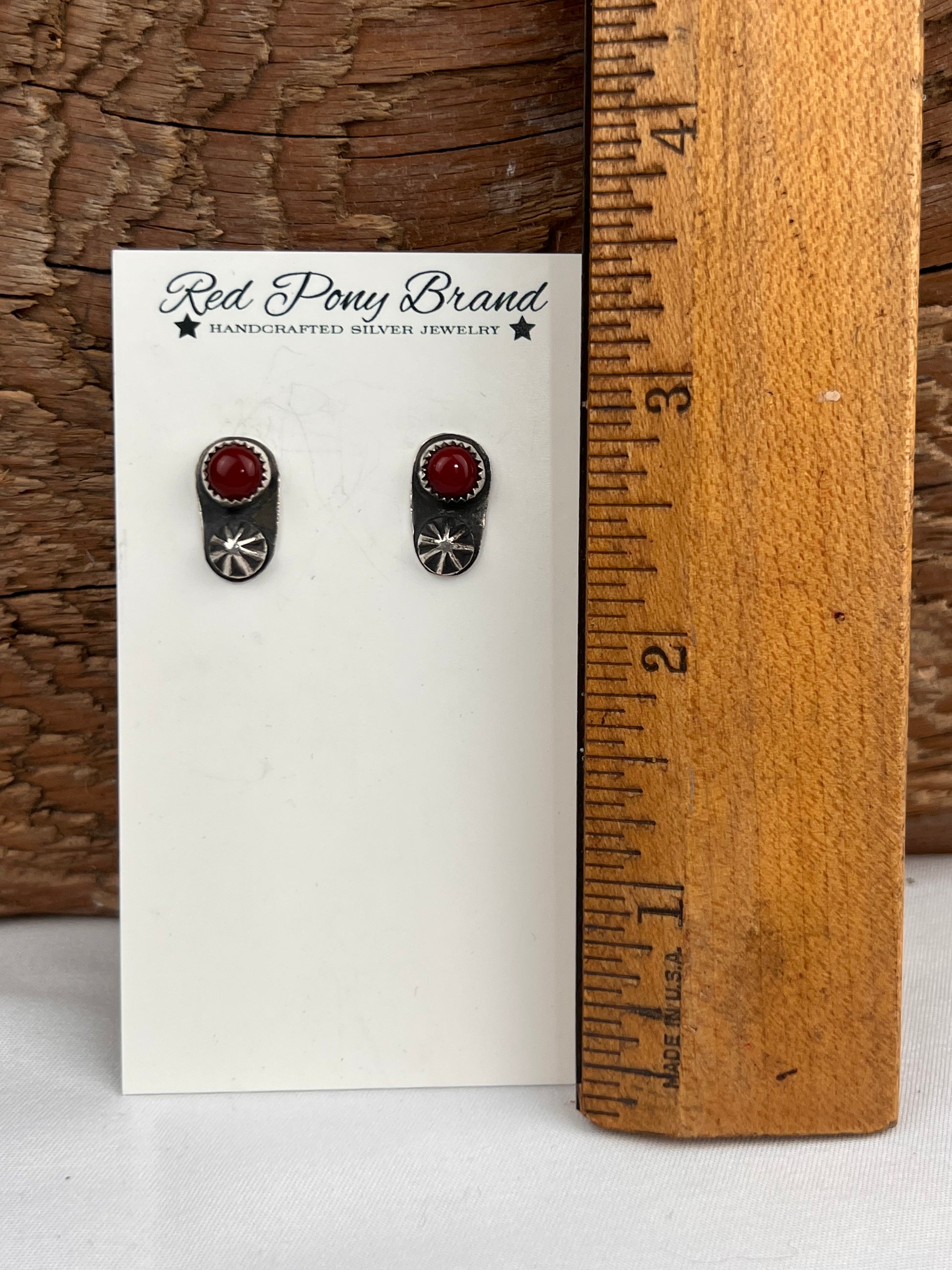 Deep red Rosarita stones and fancy silver stamps grace these studs.