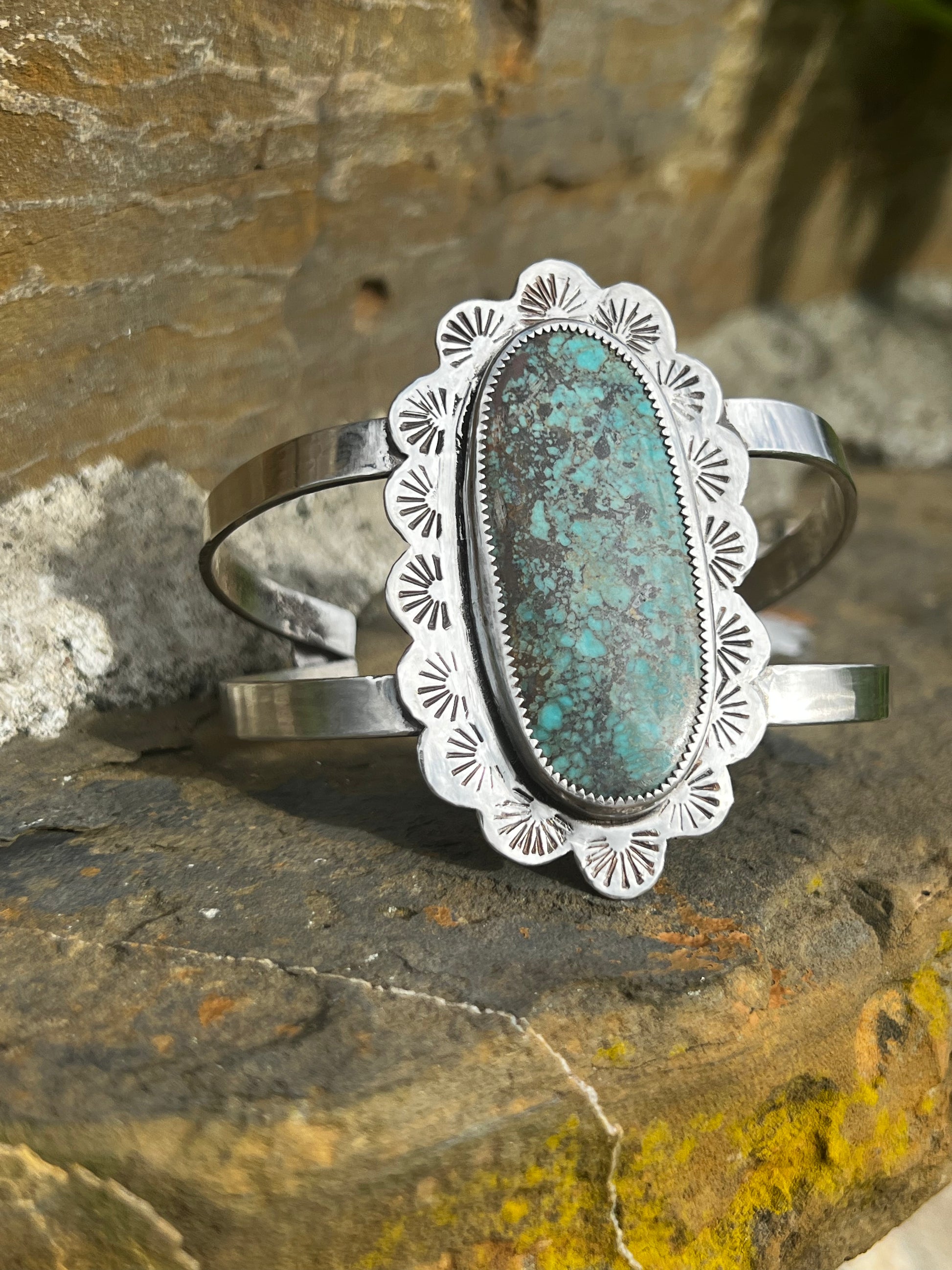 Make a bold statement with this gorgeous Royston Turquoise sterling silver cuff. Hand stamped with good vibes, this piece will add the perfect touch of boho/western and sophistication to any ensemble! Feel inspired each time you wear it.