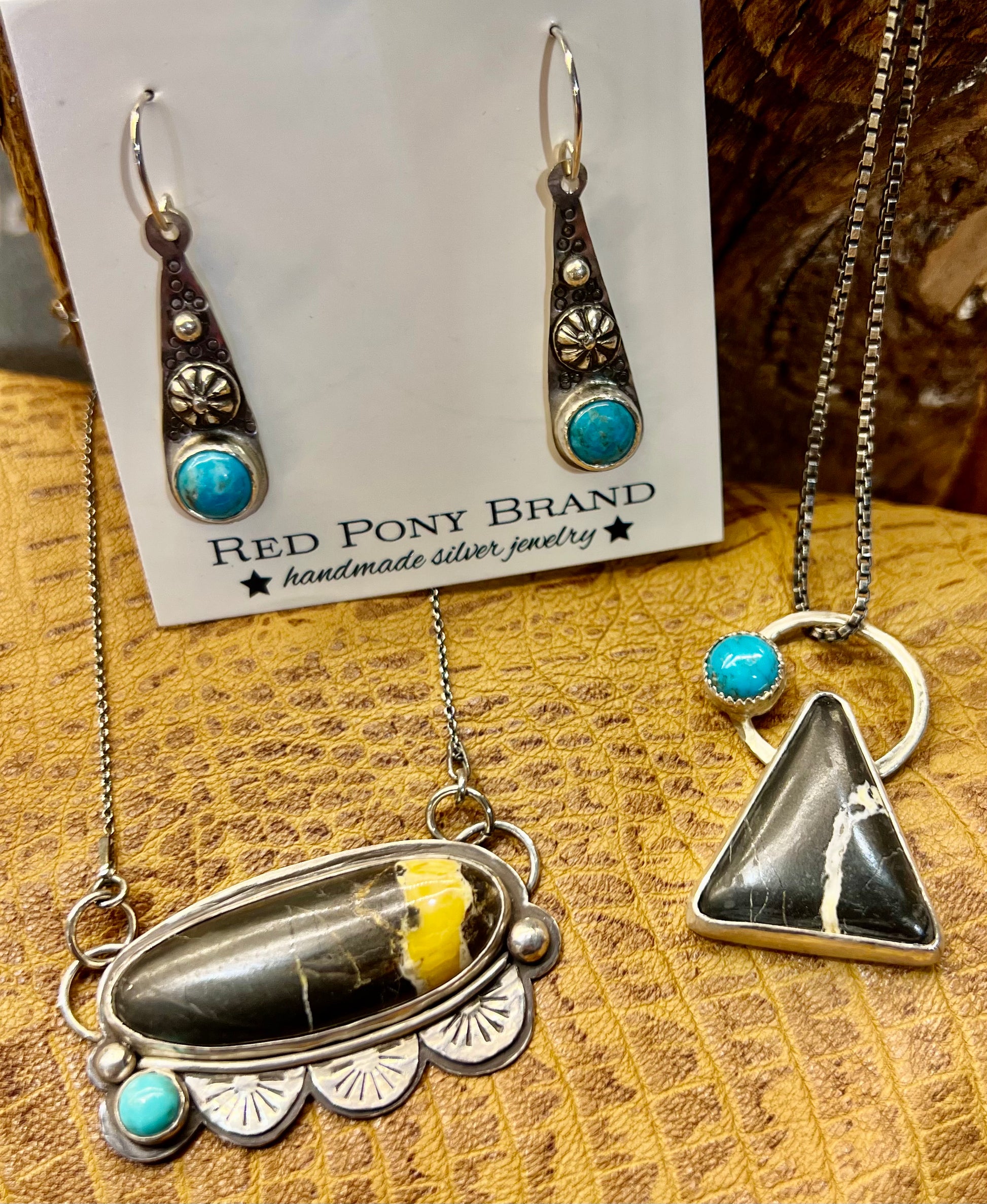 Chunky White Buffalo triangle cabachon. Accented with a Kingman Turquoise stone and hammered Sterling silver. 16” sterling chain.